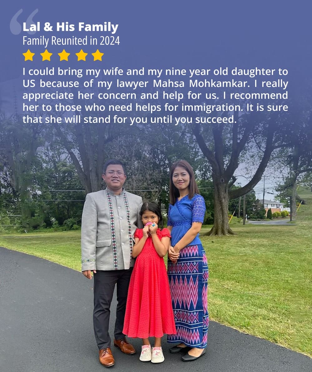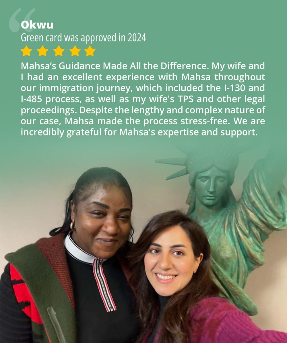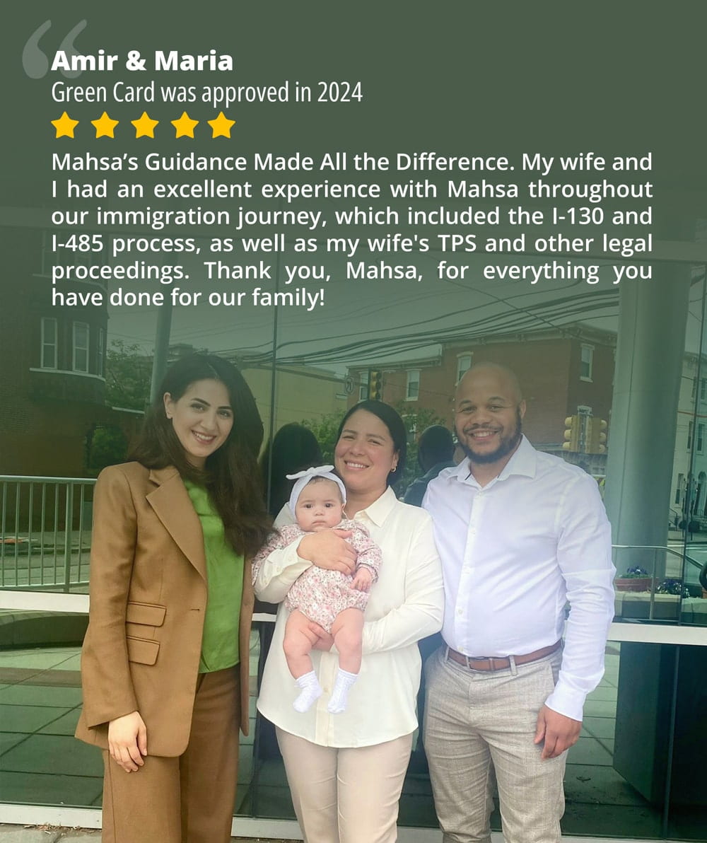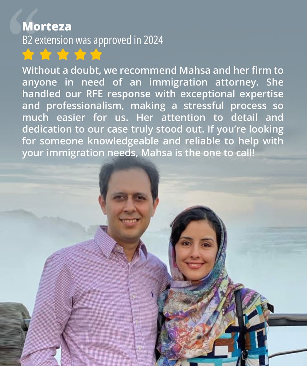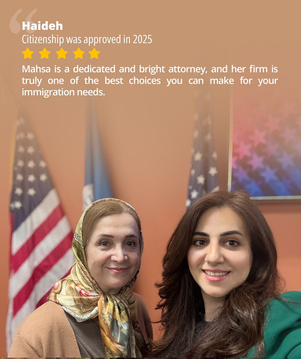 Como ex inmigrante que vivió la misma experiencia para obtener la ciudadanía estadounidense, Mahsa comprende a la perfección las inquietudes, las esperanzas y la complejidad de este proceso. Ella sabe de primera mano lo difícil que es la espera y lo reconfortante que resulta obtener la residencia legal, una experiencia que la impulsó a cumplir su sueño de convertirse en abogada especializada en inmigración.