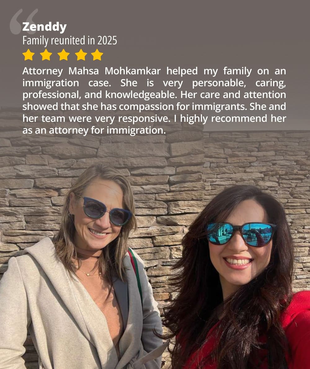 EXCELLENT Based on 100 reviews Posted on younes salimnezhadTrustindex verifies that the original source of the review is Google. I’m very satisfied with the services provided by Abogada Vida PLLC. Their team is incredibly professional, compassionate, and detail-oriented. They took the time to understand my situation and guided me through every step of the immigration process with care and confidence. I truly appreciate their transparency, dedication, and genuine commitment to helping their clients. I highly recommend Abogada Vida PLLC to anyone seeking trustworthy and effective immigration support.Posted on Moises BarwisTrustindex verifies that the original source of the review is Google. Great team to work with! They were guiding me patiently and professionally during the entire process, making it feel “painless”, even though it takes time when dealing with immigration cases. The costs were very reasonable. The interaction was a few times over the phone, with the majority by email, exchanging information, reviewing the immigration forms prior to be sent to the USCIS, making this process very interactive on my side, validating that the information was accurate. I have done a couple processes with them, with awesome results. I am still in contact with the lawyers, since I am trying to finish my legal process with their help and support. I strongly recommend to give them a try.Posted on Yovanny c ColladoTrustindex verifies that the original source of the review is Google. Muy buena atencion y muy satisfecho con todas mis inquitudesPosted on Stanly PrabhuTrustindex verifies that the original source of the review is Google. I had a consultation with Ms.Mahsa for applying I-485, and the firm was quick to respond my questions ans scheduled the session. On the session Ms. Mahsa neatly explained all the procedures and clarified all the questions we had. Although I couldn't filed thru them due to my company had finally proceed with their contract law firm, I would have go with Mahsa if my company not done it. I would recommend Ms.Mahsa for their clarity and knowledge on the immigration cases.Posted on Afsaneh RabieyTrustindex verifies that the original source of the review is Google. I highly recommend Abogada Vida and Attorney Mahsa Mohkamkar for anyone seeking exceptional immigration legal services. Mahsa is an outstanding lawyer who combines deep legal knowledge with genuine compassion for her clients. She takes the time to clearly explain every option, keeps communication open and transparent, and ensures that you always feel informed and supported throughout the entire process. What truly sets Mahsa apart is her dedication and professionalism, she approaches every case with care, attention to detail, and a strong commitment to achieving the best possible outcome. Whether you are dealing with a complex immigration matter or simply need reliable legal guidance, Attorney Mahsa Mohkamkar is someone you can fully trust. She is knowledgeable, ethical, and genuinely invested in helping her clients succeed.Posted on Parisa MansourianTrustindex verifies that the original source of the review is Google. I had a consultation session with Mahsa Mohkamkar regarding my employees’ visa statuses. She was very patient and knowledgeable, and she walked me through all the different scenarios, explaining their pros and cons. I’m very happy with her service and will definitely use her for our future cases as well.Posted on Ali SarrafTrustindex verifies that the original source of the review is Google. I had a consultation and was impressed by her professionalism and expertise. She explained everything clearly and answered all my questions with patience. I highly recommend her to anyone seeking reliable advice.Posted on asal saeedfarTrustindex verifies that the original source of the review is Google. I consulted Mahsa regarding an immigration question. She was incredibly professional, knowledgeable, and took the time to explain everything clearly. Highly recommend!Posted on Hossein DashtiTrustindex verifies that the original source of the review is Google. My family trusts Mahsa’s expertise and we appreciate all she does!